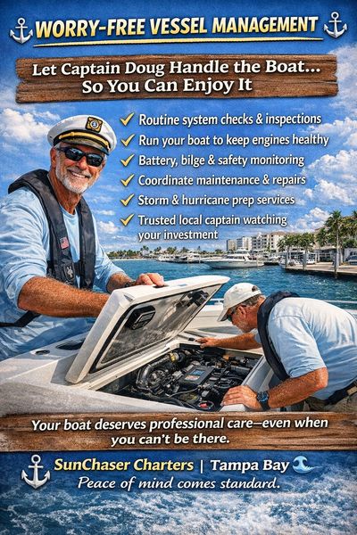 SunChaser Charters provides reliable, hands-on vessel management to keep your boat safe, maintained, and ready to run. From routine checks and system inspections to running your vessel, coordinating maintenance, and preparing for storms, Captain Doug treats your boat like his ownβgiving you peace of mind when you canβt be on the water. β